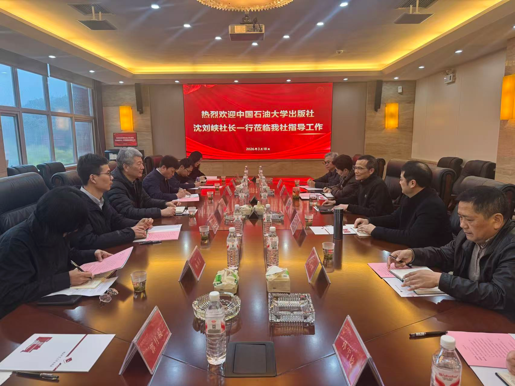 2026年3月18日,中国石油大学出版社社长沈刘峡、副总编辑郜云飞一行莅临我社考察交流。总编辑黄林、副社长徐江涛、副总编辑邓杰及相关部门负责人出席座谈会,双方围绕出版主业、数字转型、管理机制等议题深入交流、共话发展。