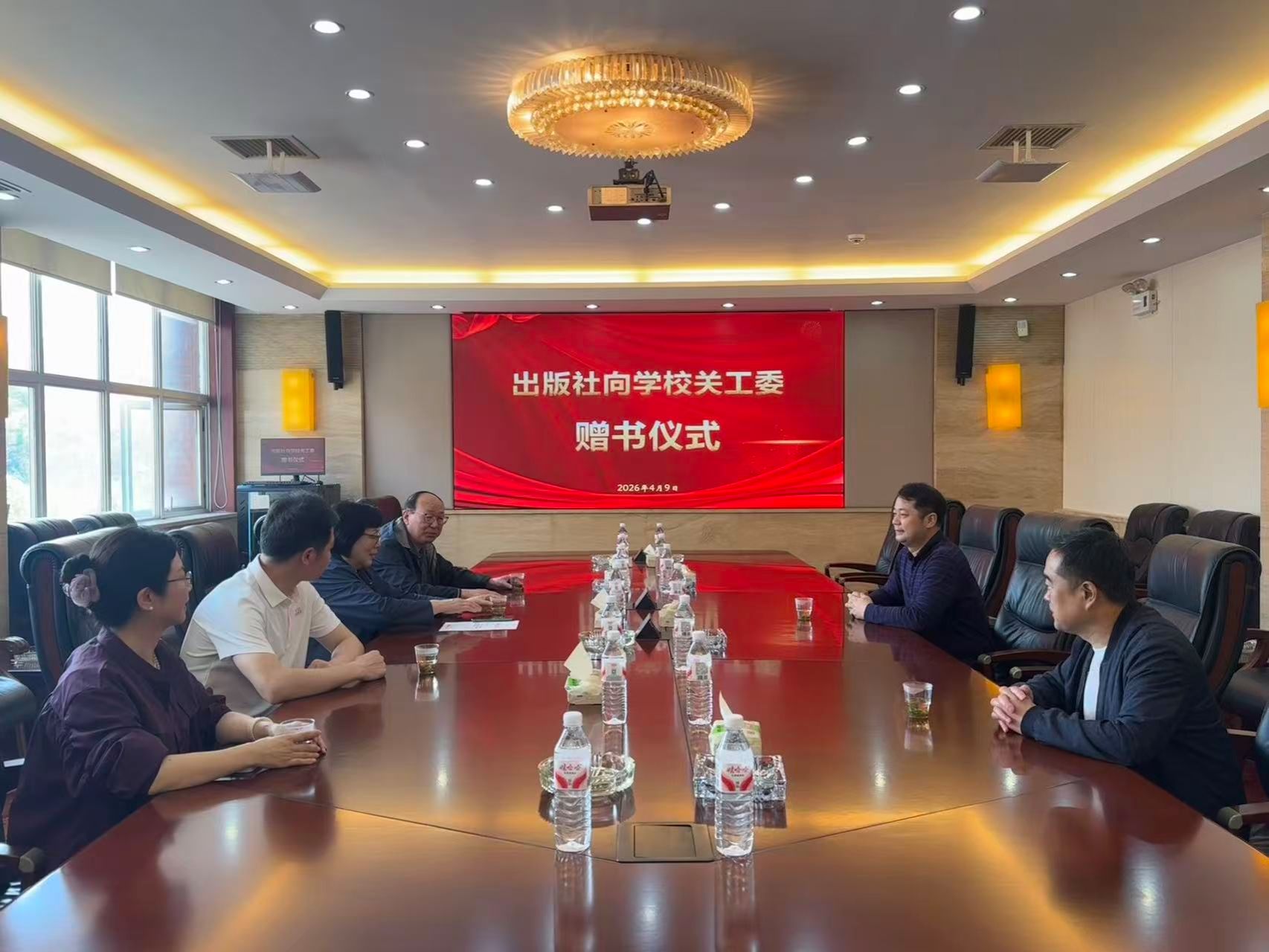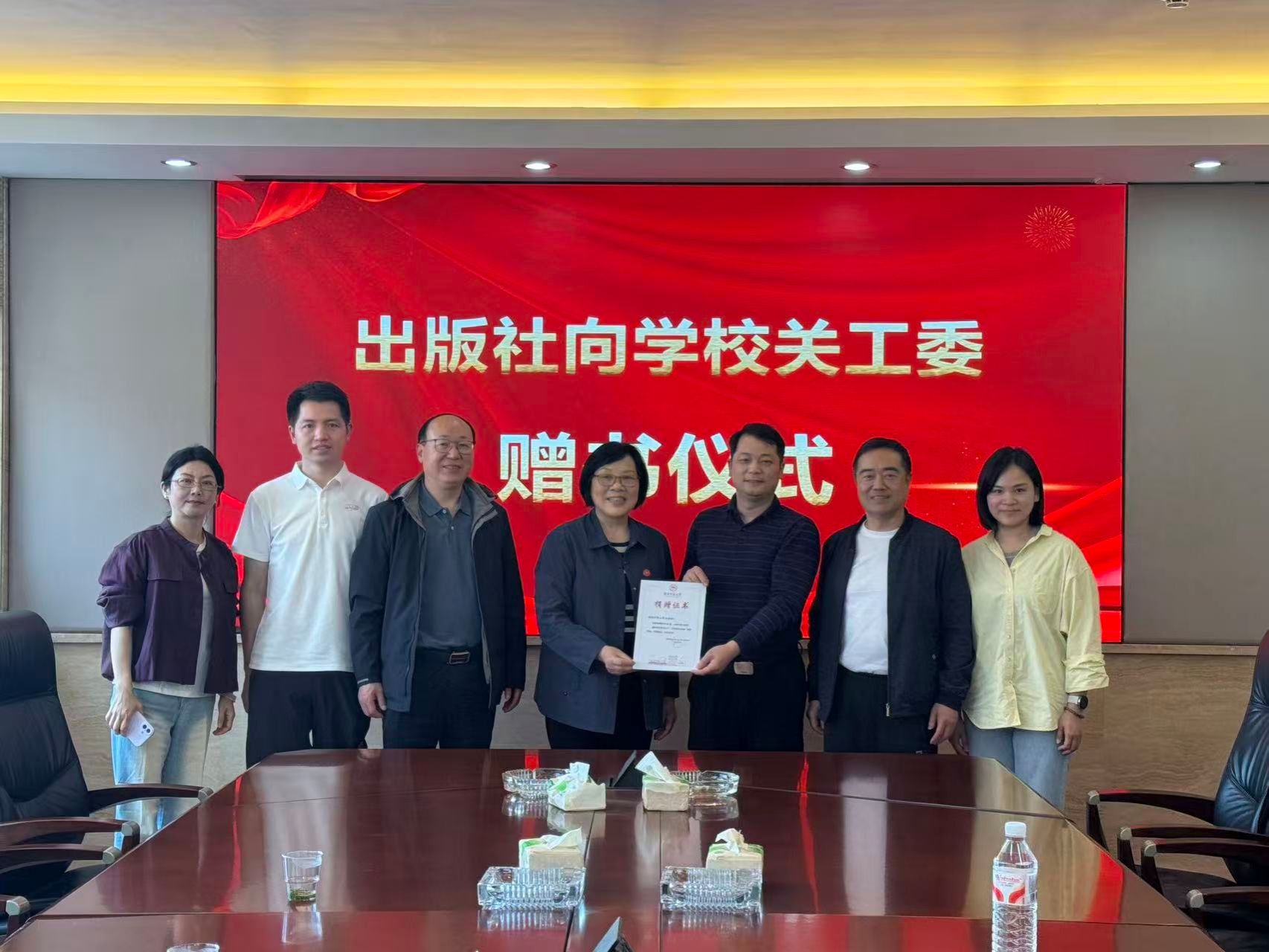 为助力学校关心下一代委员会工作,2026年4月9日,我社向湖南师范大学关心下一代工作委员会(校关工委)举行书籍捐赠仪式。校关工委常务副主任徐书华、副主任何杨波一行莅临出版社,我社副社长徐江涛、社长助理向纯武出席活动。